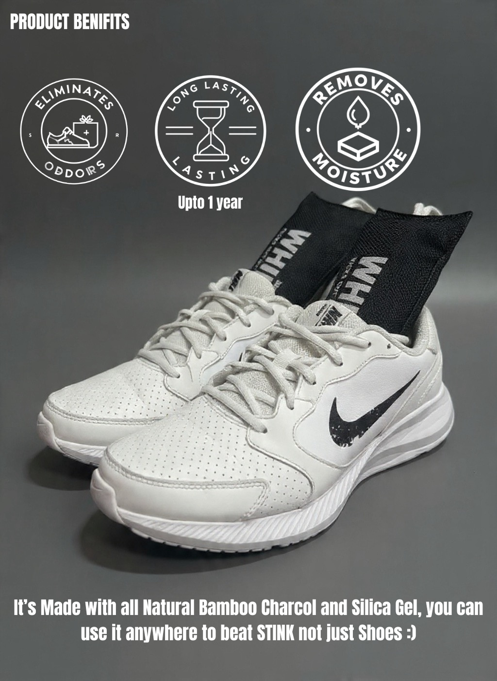 Crafted with a powerful dual-action blend of natural Bamboo Charcoal and premium Silica Gel. This superior combination actively targets and neutralizes odor-causing bacteria while absorbing excess moisture, delivering the ultimate freshness and protection.